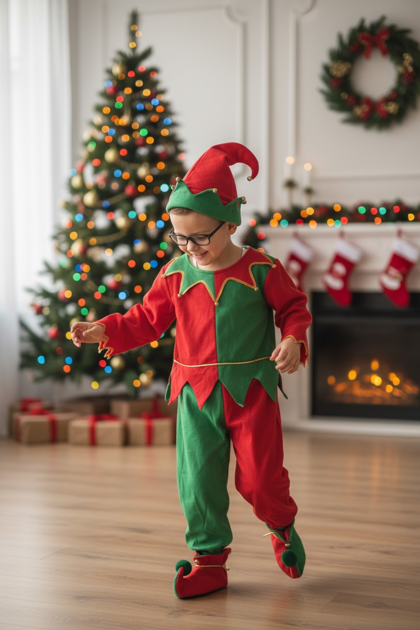 Costum baiat Spiridus , rosu si verde, cu tematica de Craciun, este deosebit de jucaus si vesel.