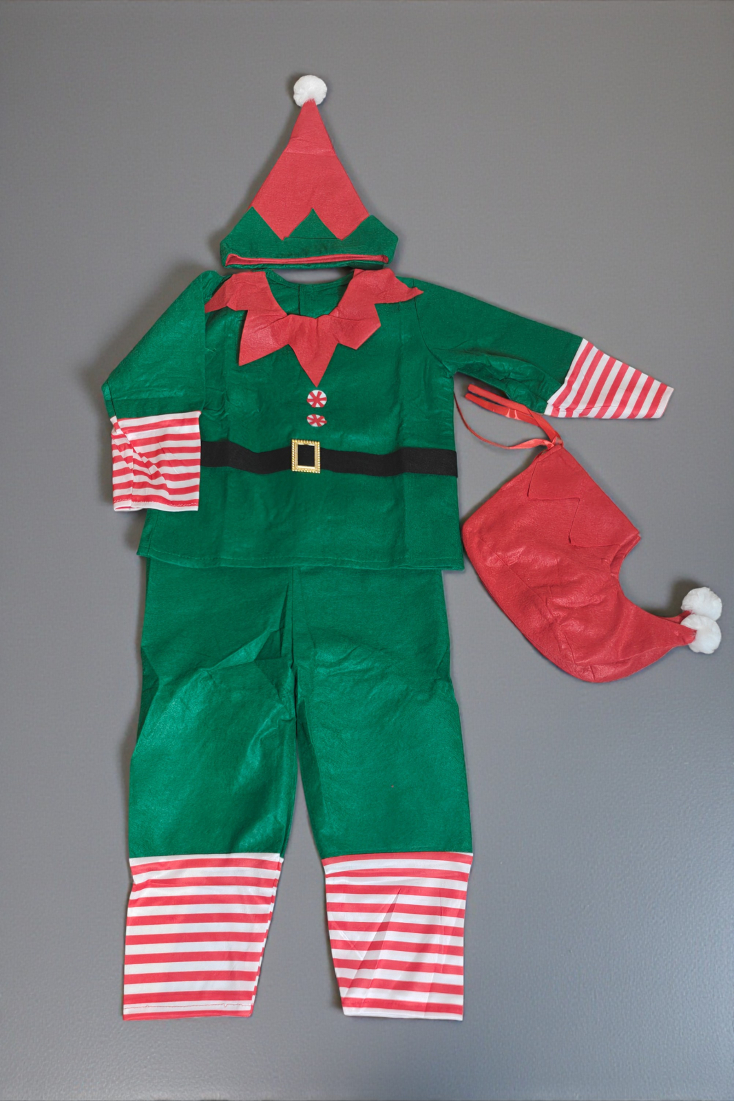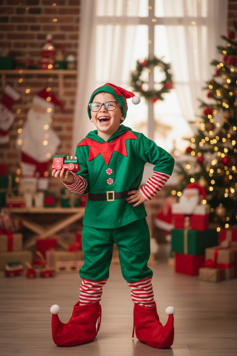 Costum baiat Spiridus , rosu si verde, cu tematica de Craciun, este deosebit de jucaus si vesel.