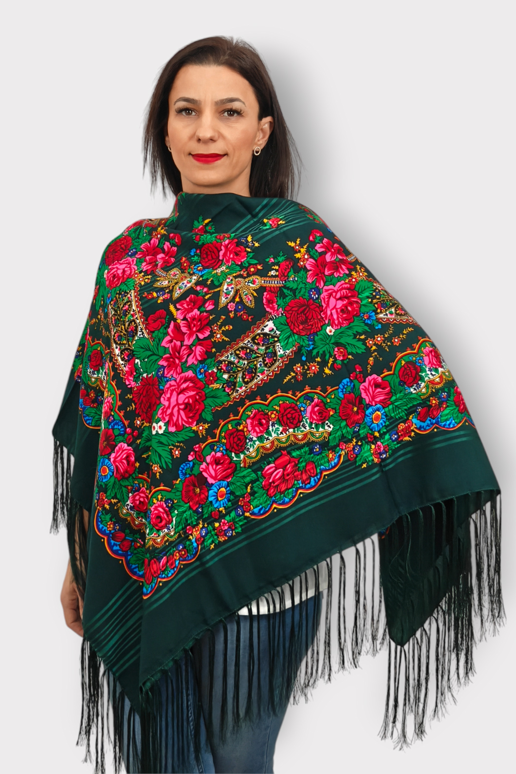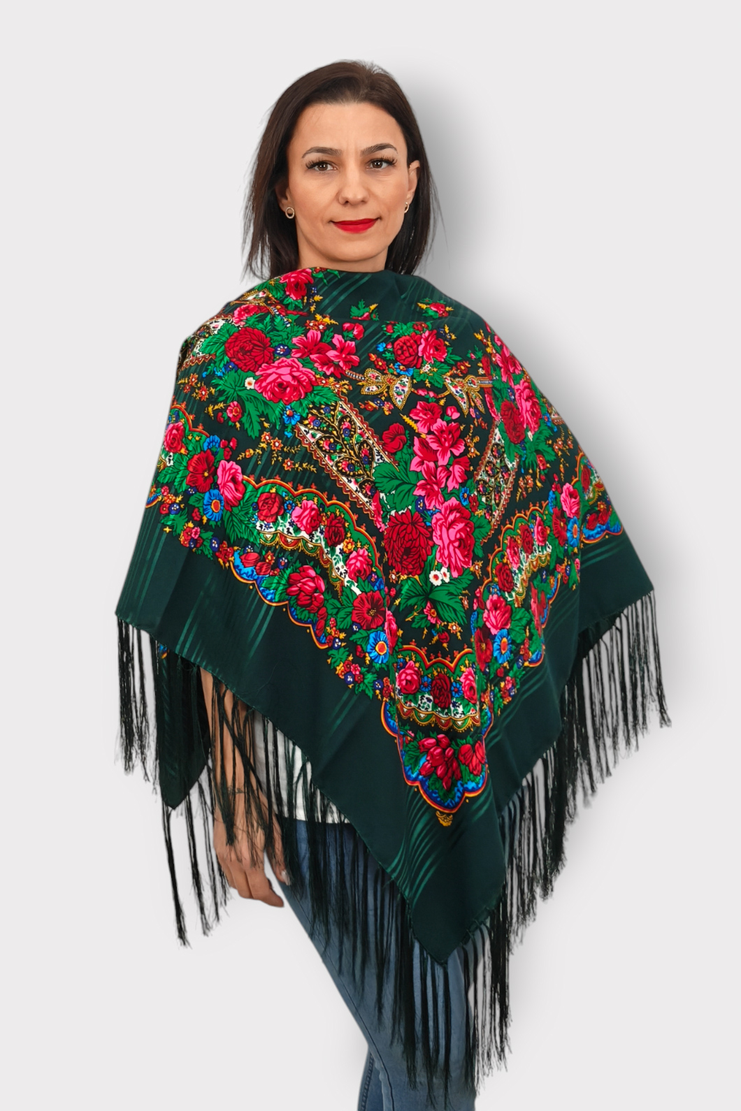 Un accesoriu extrem de cautat, datorita imprimeului spectaculos. Este decorat cu franjuri.