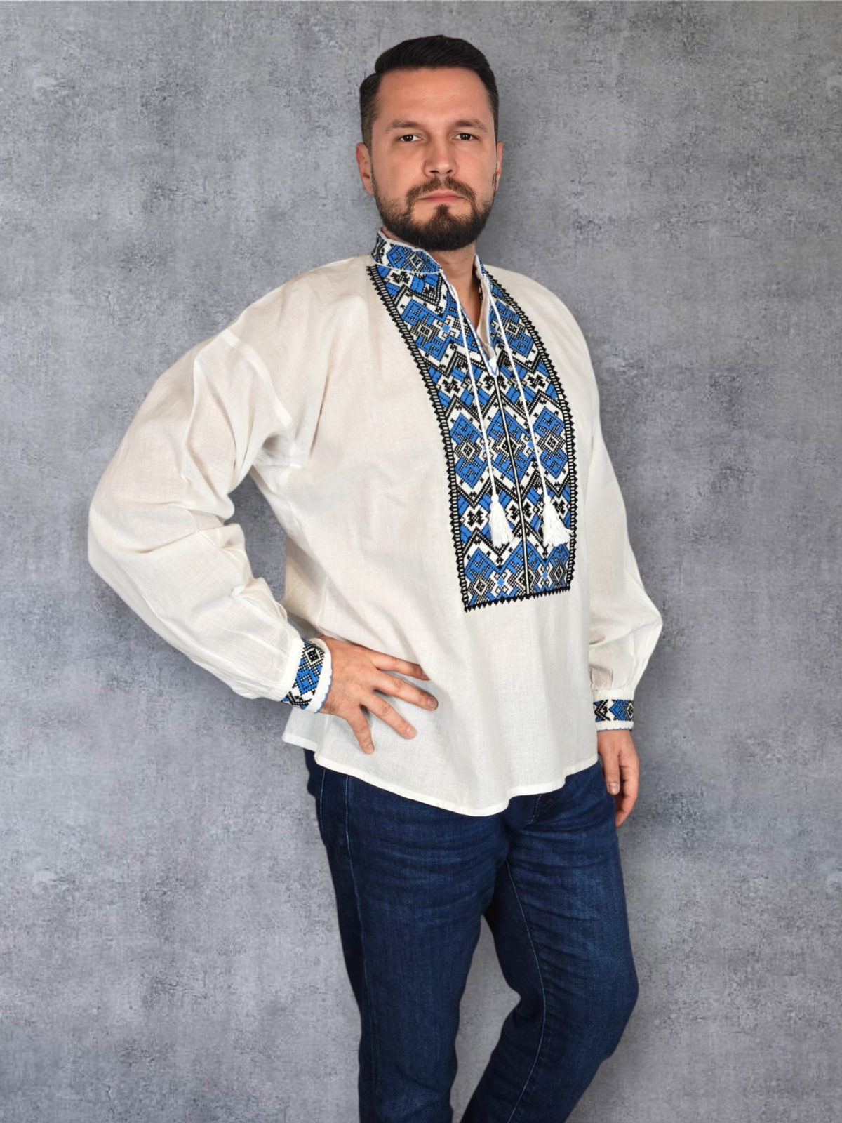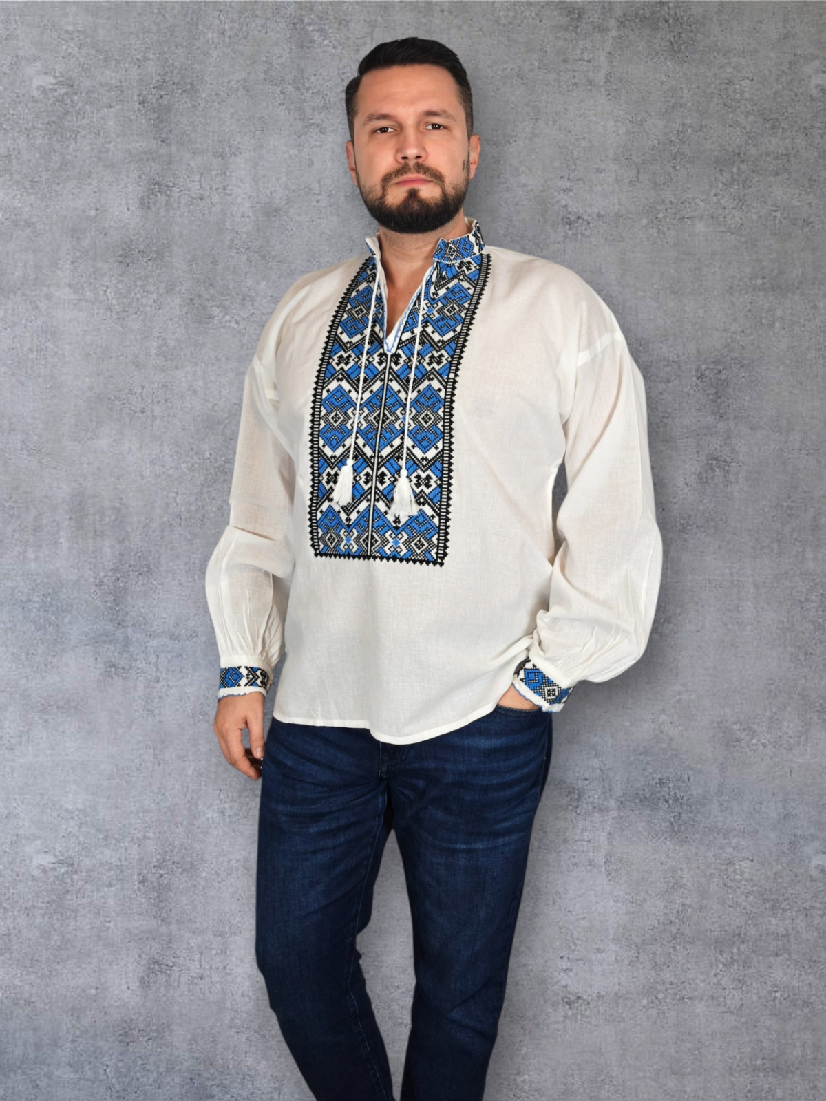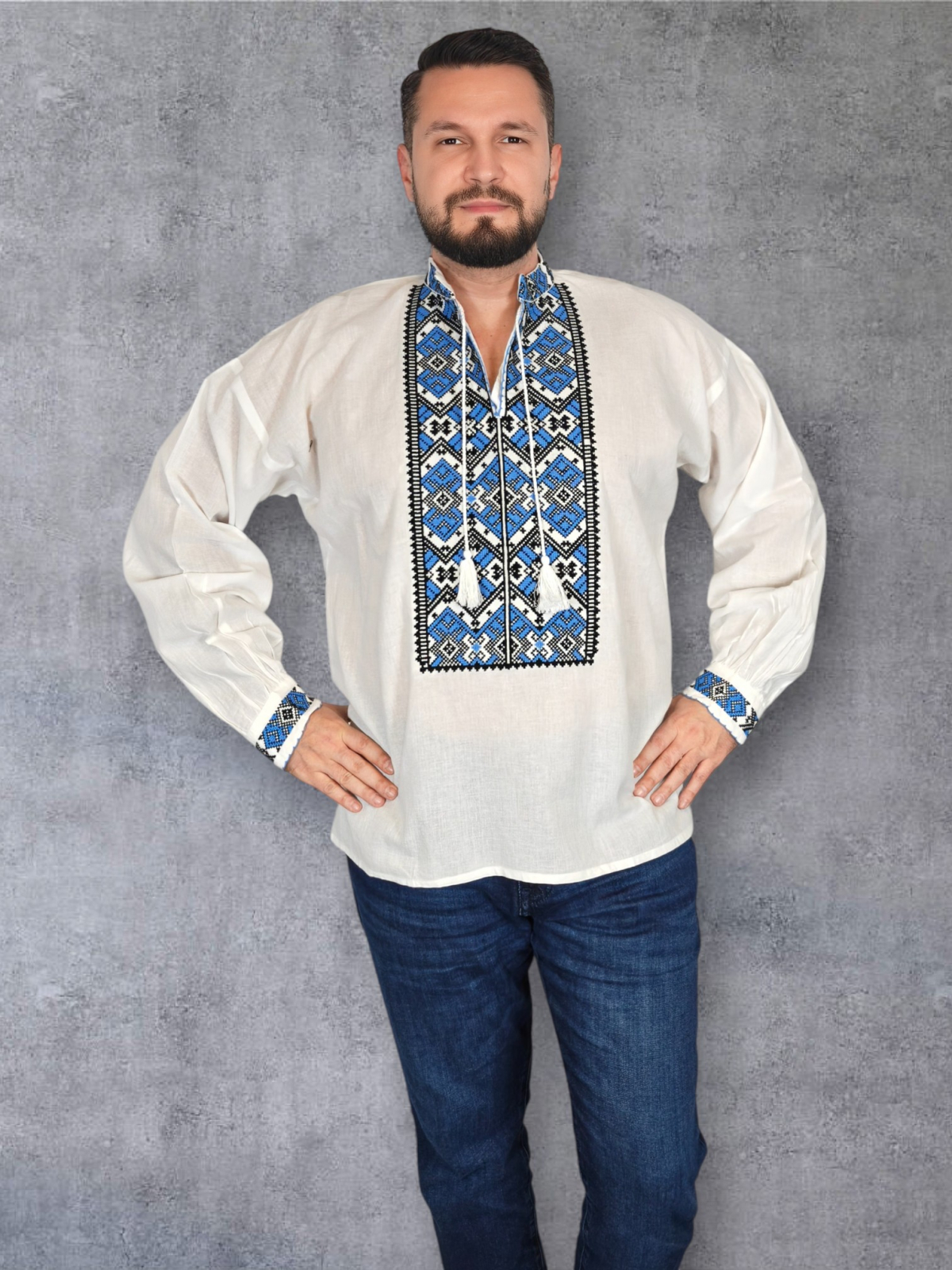 Culoare: alb cu broderie albastru si negru