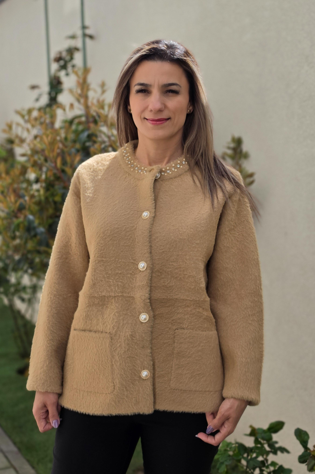 Cardigan/pulover pentru sezonul toamna-iarna, lejer, inchidere cu nasturi, margele aplicate.