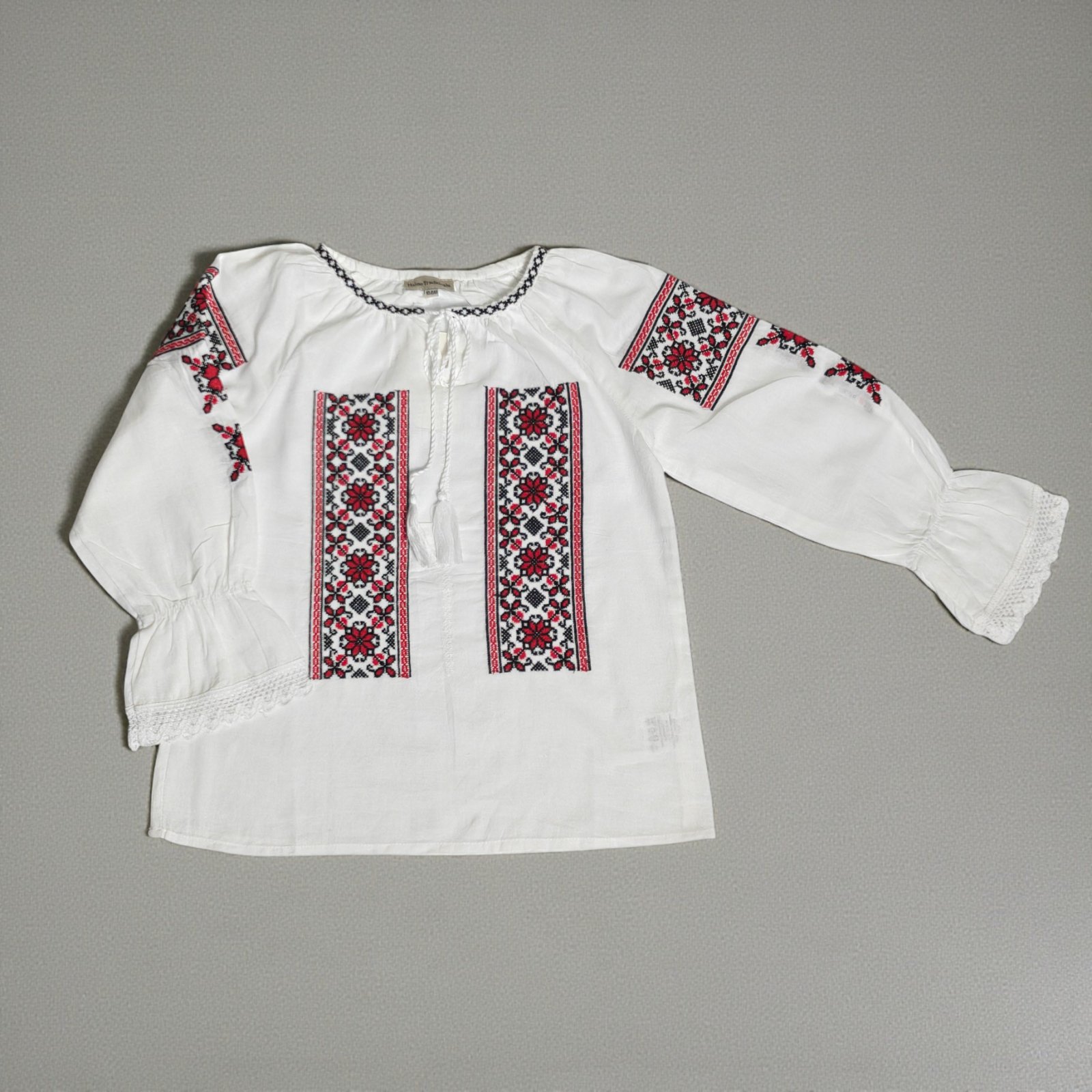 | Ie traditionala fetite Material: bumbac 100% Culoare: alb cu broderie rosu si negru Broderia este cusuta la masina |