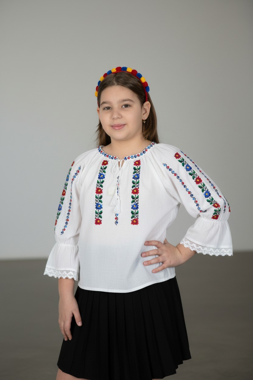 | Ie traditionala fetite Material: bumbac 100% Culoare: alb cu broderie colorata Broderia este cusuta la masina |