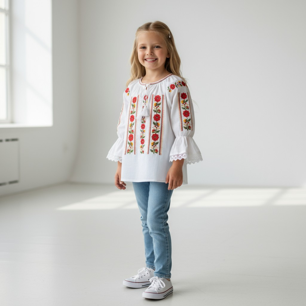 Culoare: alb cu broderie colorata