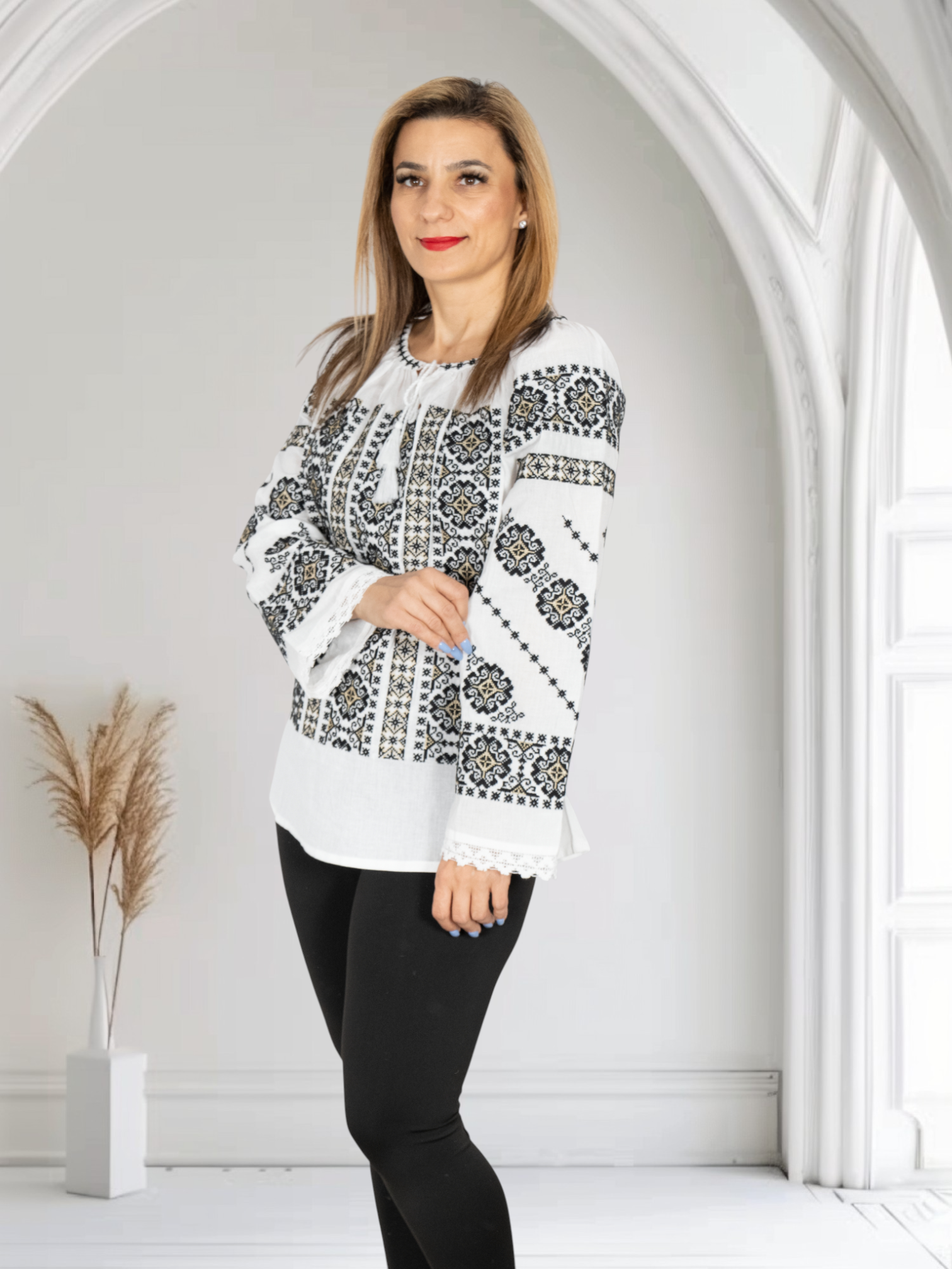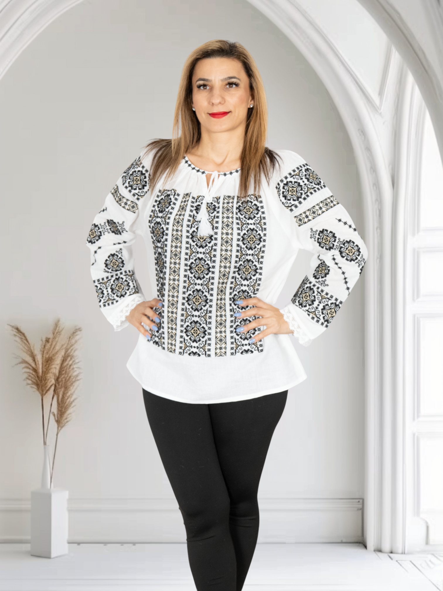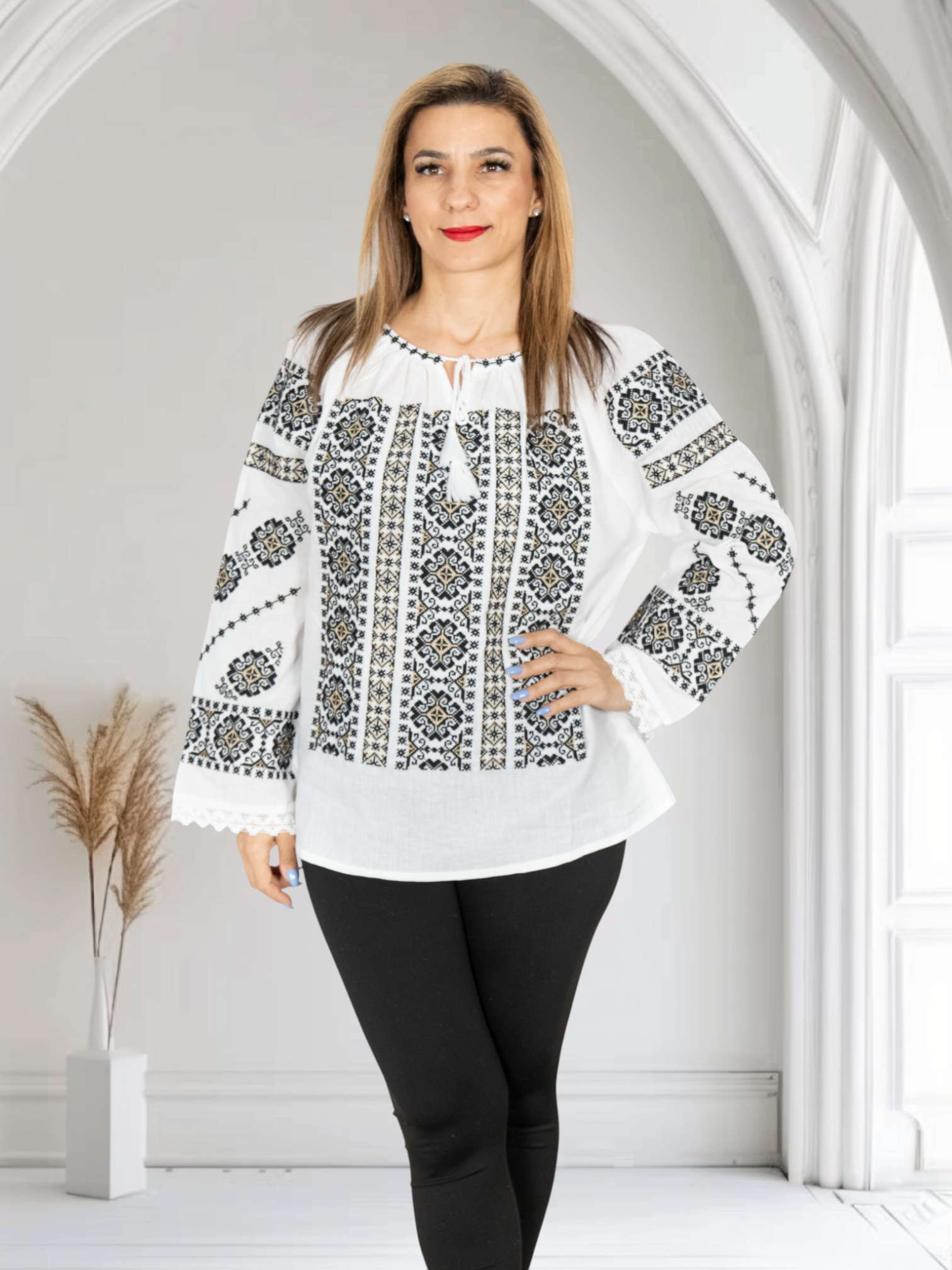 Culoare: alb cu broderie negru si crem