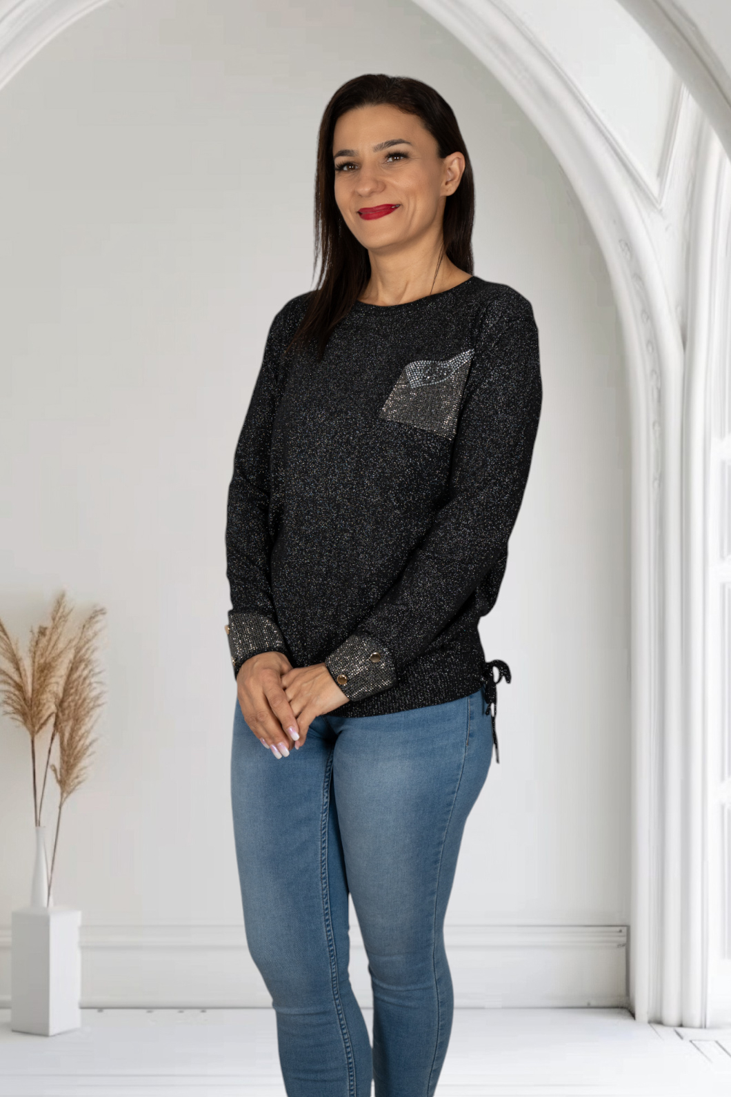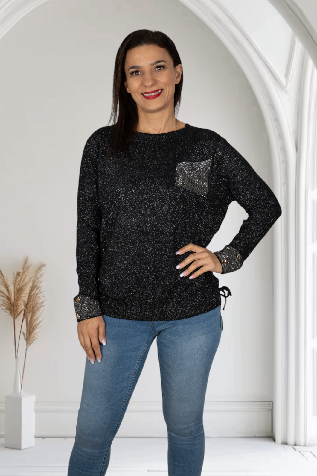 Pulover elegant din casmir, cu broderie cusuta la masina.