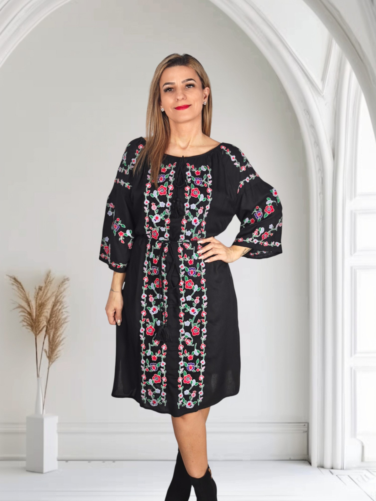 Rochia este dublata, cu snur in talie si maneca lunga. Rochie lejera la purtat.