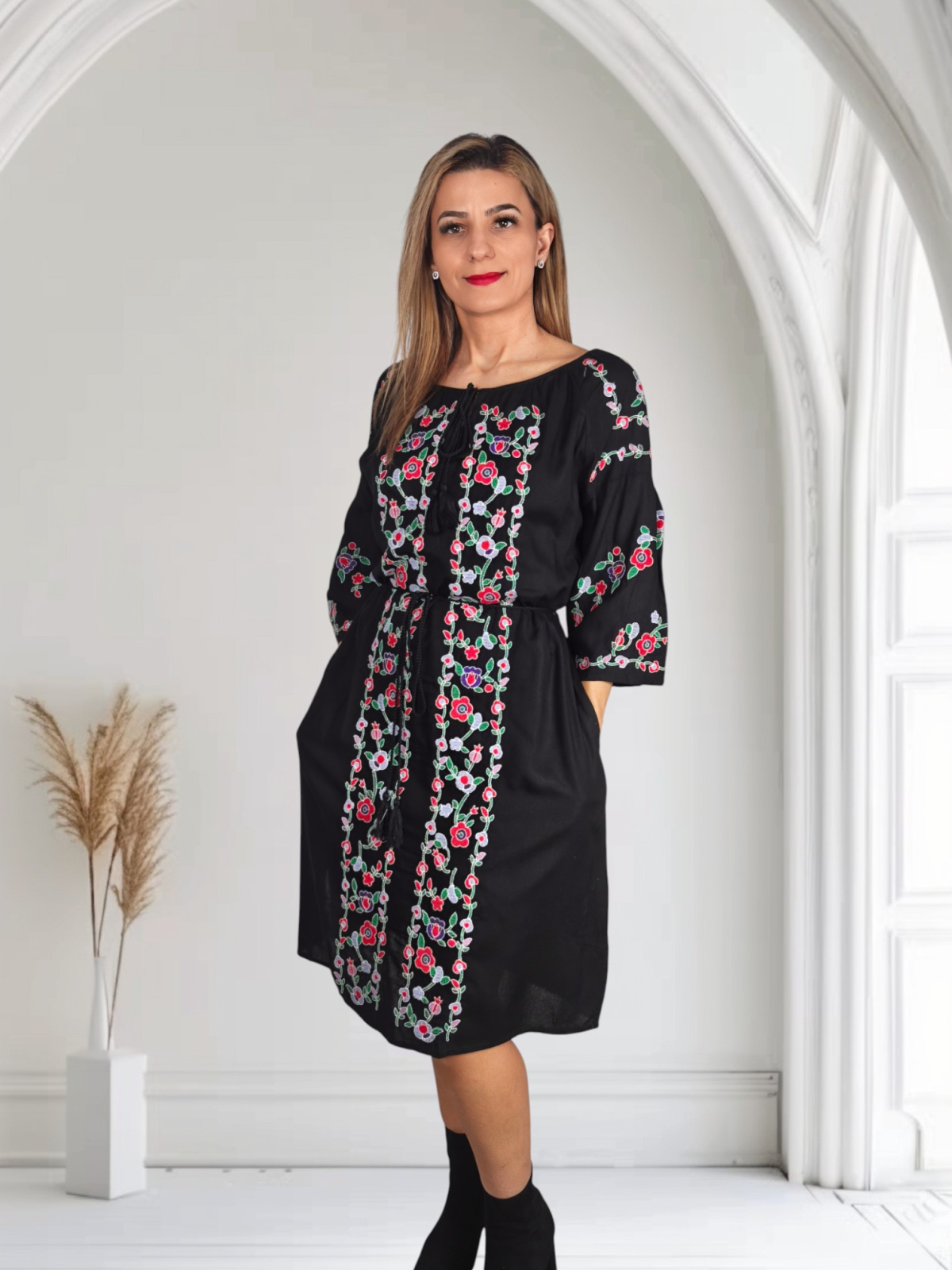 Rochia este dublata, cu snur in talie, maneca lunga si buzunare. Rochie lejera la purtat.