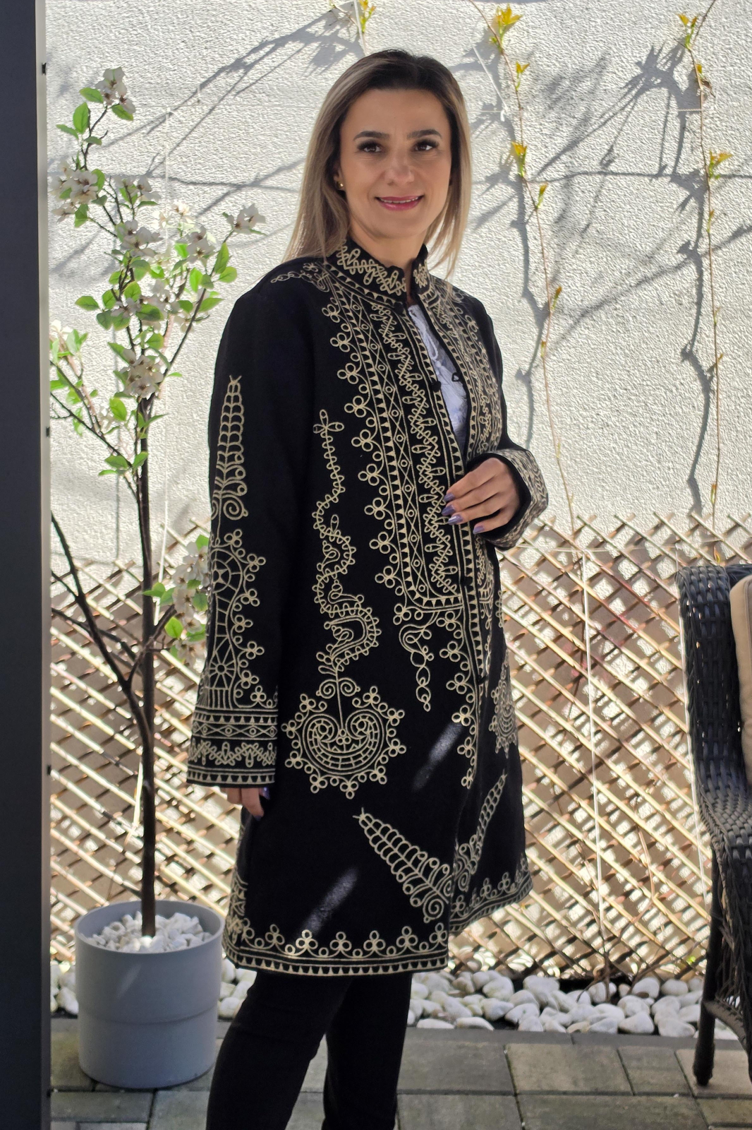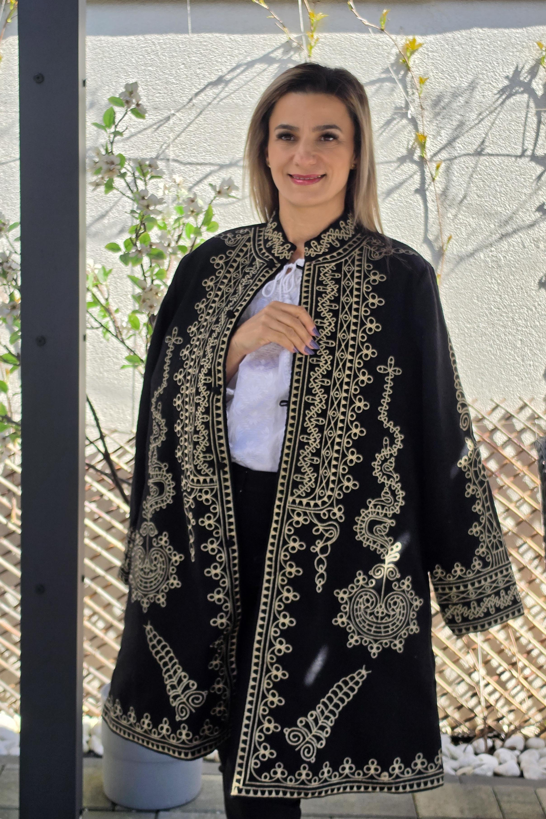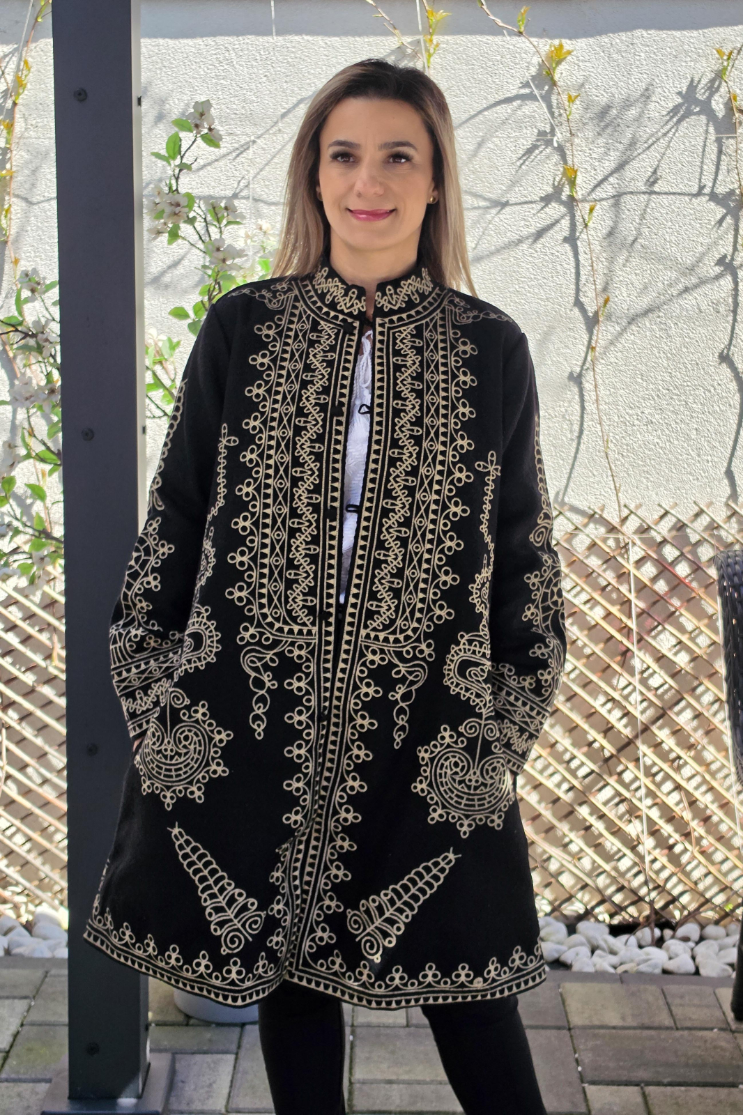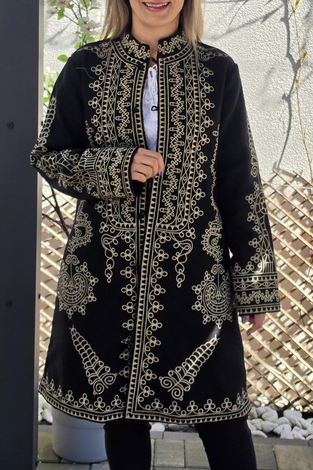 Pardesiul este captusit, broderie cusuta la masina.