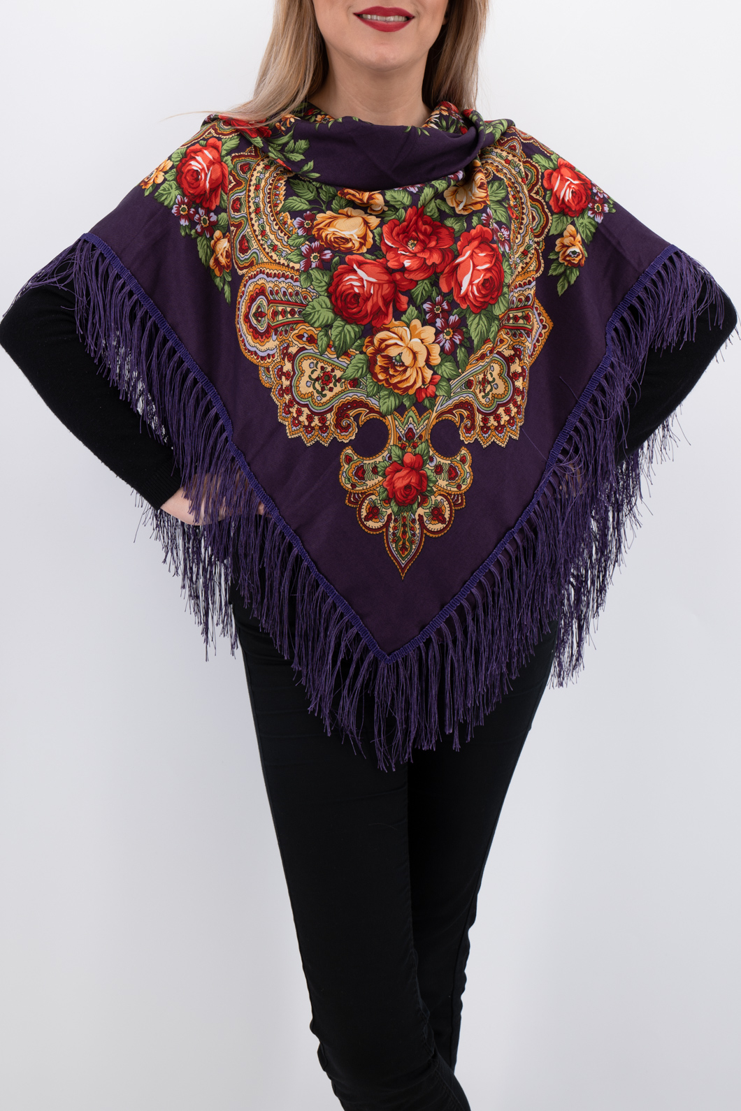 Un accesoriu extrem de cautat, datorita imprimeului spectaculos. Este decorat cu franjuri lungi.