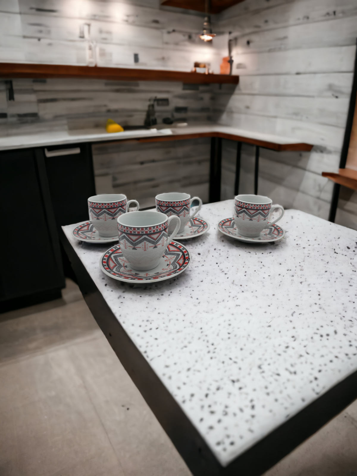 Setul pentru cafea din ceramica, decorat cu motive traditionale, este alcatuit din 6 cani si 6 farfurii.