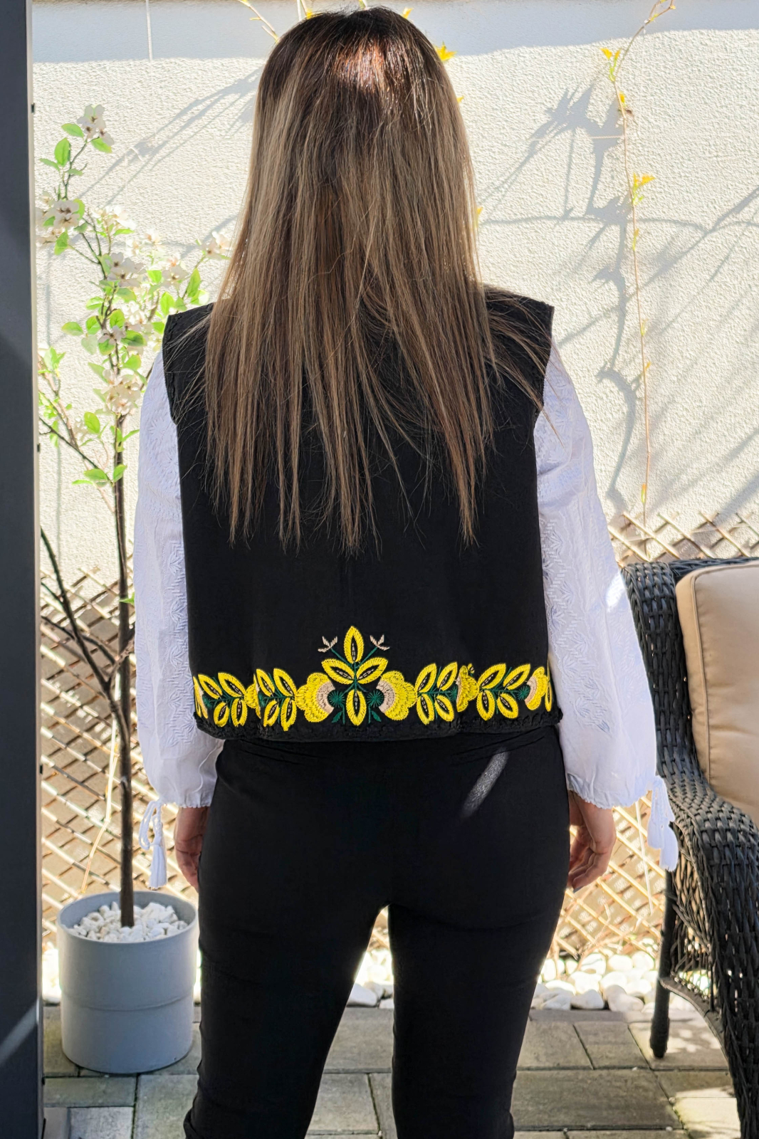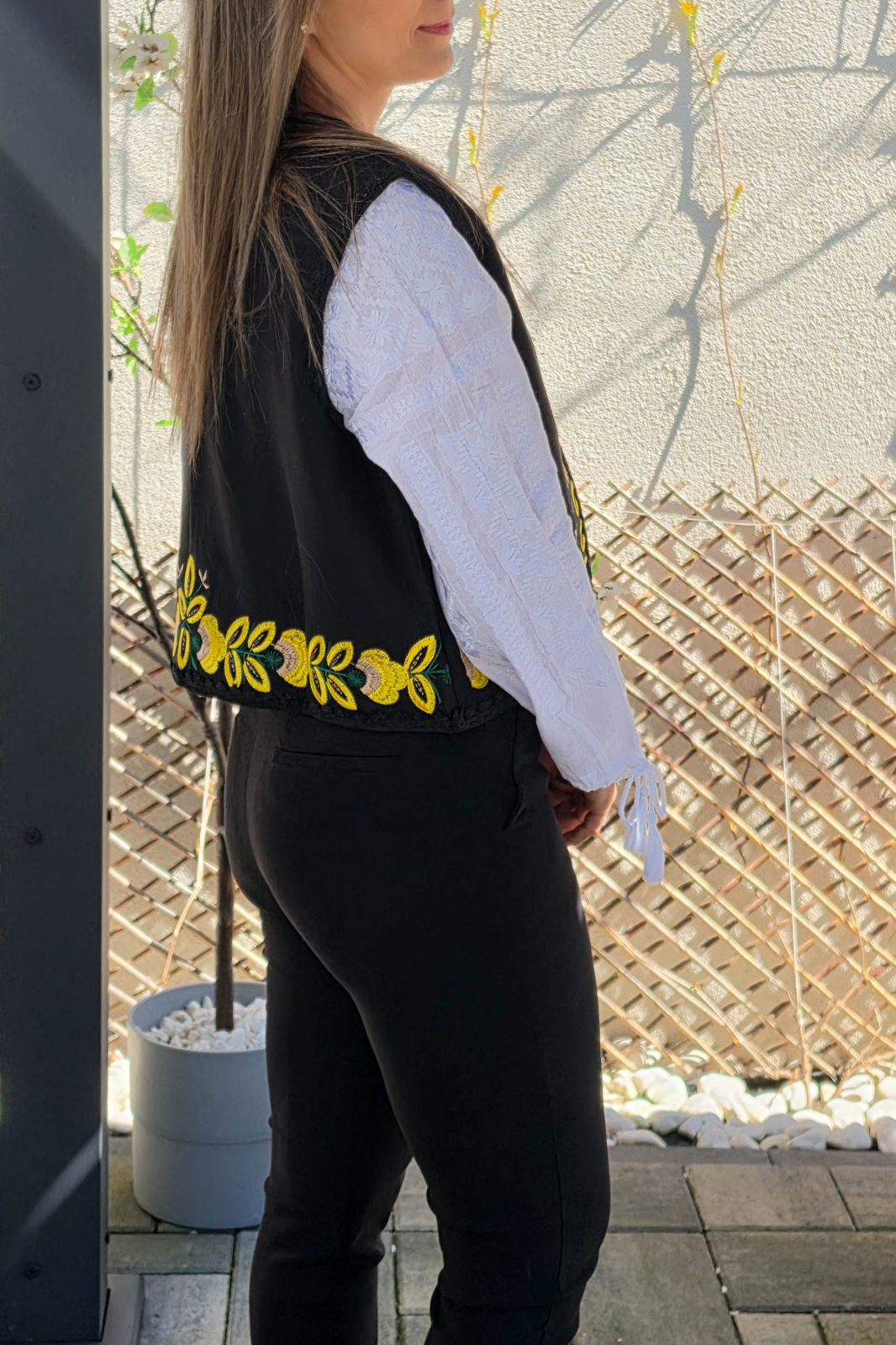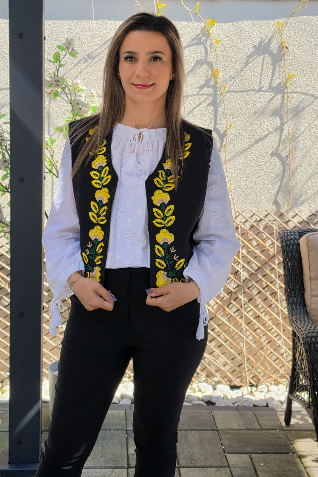 Vesta brodata cu model traditional din poliester/bumbac, captusita.