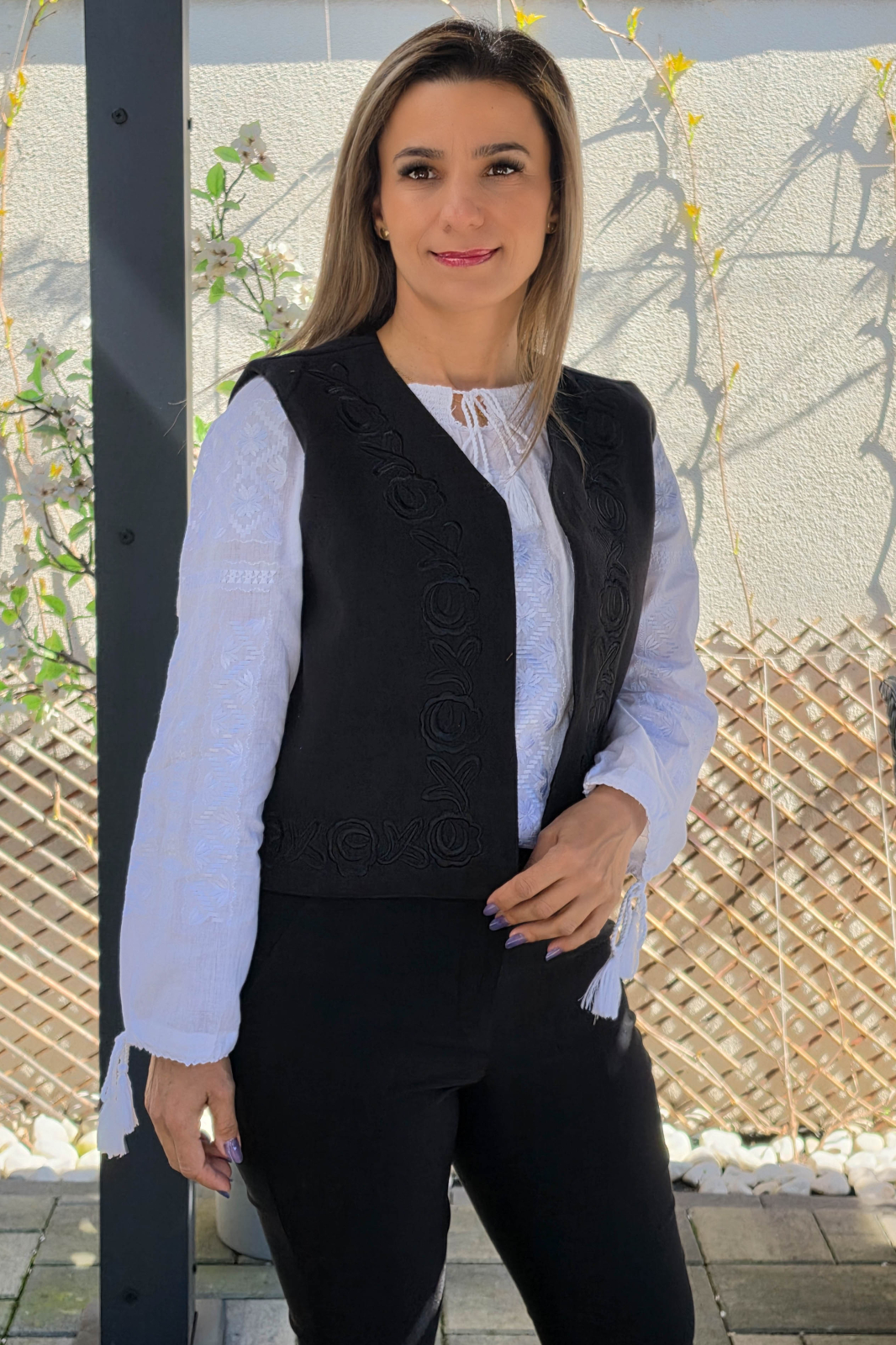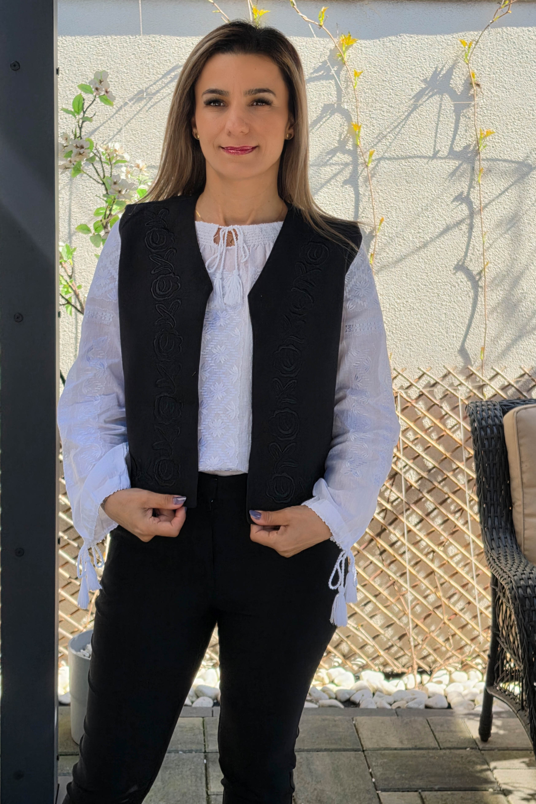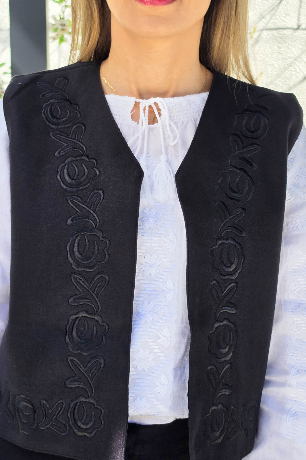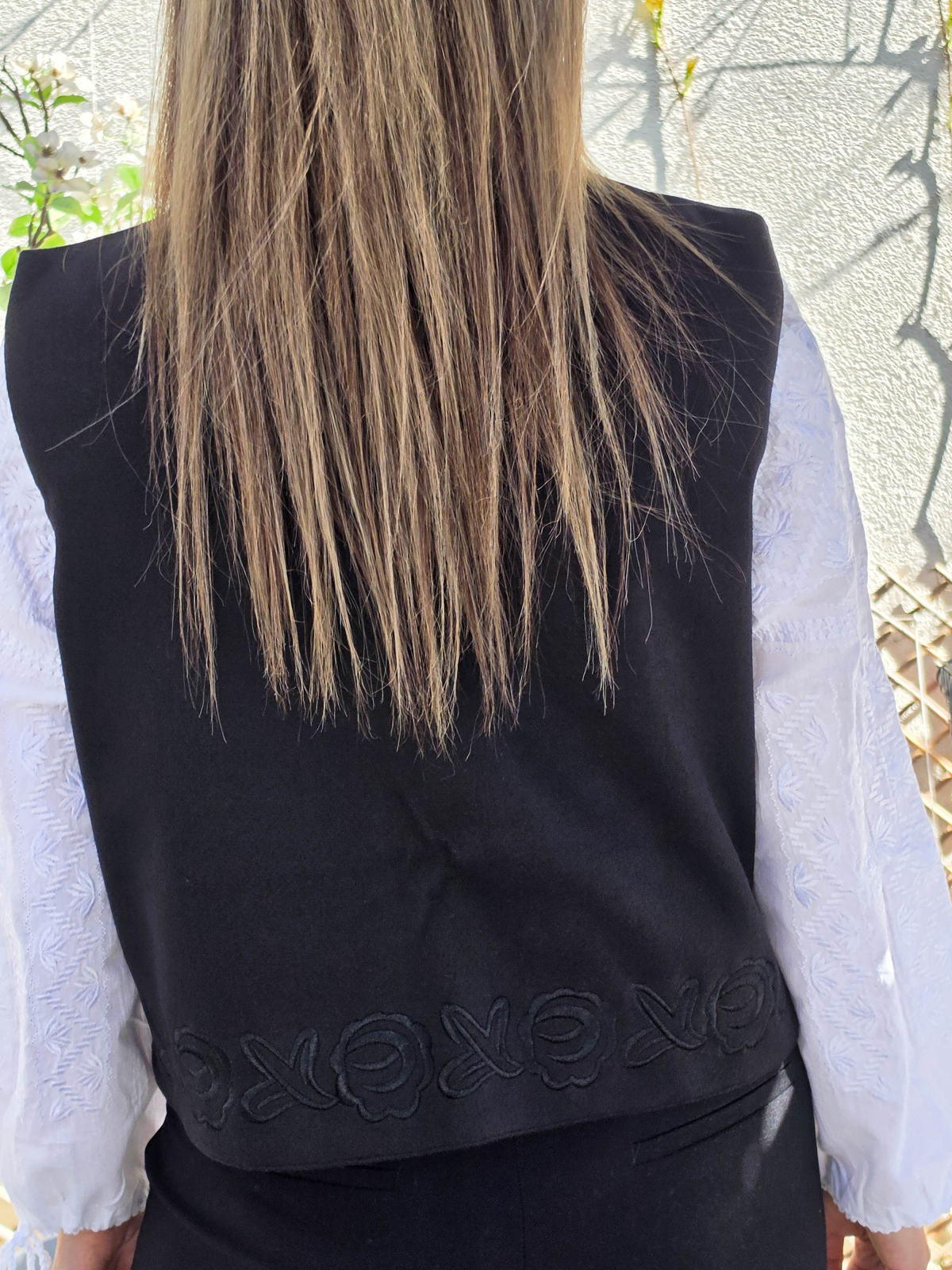 Vesta brodata cu model traditional din poliester/bumbac, captusita.