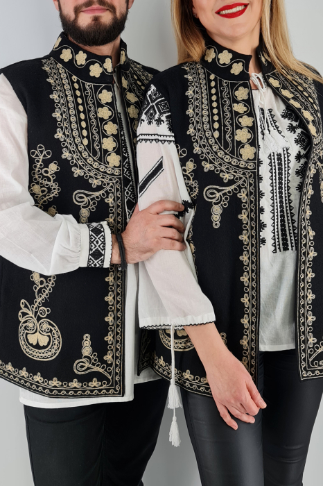 Material: stofa si lana, vesta este captusita. Broderie cusuta la masina.
